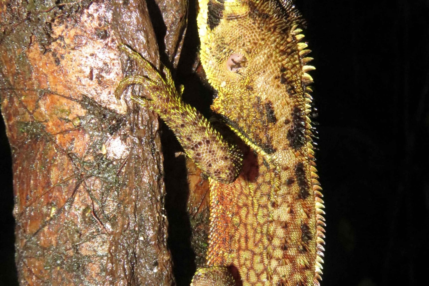 قد تكشف الرحلات الليلية المصحوبة في منطقة تشوكو البيئية في الإكوادور عن ثعبان شجرة بلونتهيد (Imantodes cenchoa)، وثعبان أمريكا الوسطى (Boa imperator)، وتيرسيوبيلو (Bothrops asper)، وثعبان الرموش الشمالي (Tropidophis boulengeri)، وثعبان أرض ديسباكس (Atractus paucidens)، من بين ثعابين أخرى، إلى جانب الضفادع النادرة مثل ضفدع أورويولا الزجاجي (Sachatamia orejuela) والجواهر الثمينة مثل ضفدع شجرة إيمبابورا (Boana picturata) وضفدع الورقة المنزلق (Agalychnis spurrelli)، من بين ضفادع أخرى، بما في ذلك العديد من ضفادع المطر (Pristimantis spp.). قد تشمل السحالي المحلية المثيرة للاهتمام أنول بلوتشبيلي (Anolis maculiventris)، وأنول بيربل (Anolis purpurescens)، وإغوانا بوكورت القزمة (Enyalioides heterolepis)، وتييد الخام (Echinosaura horrida)، من بين أمور أخرى. قد تجد أيضًا السمندل والأعمى! في صباح اليوم التالي، قد تكشف مشاهدة الطيور غير الرسمية عن أبرز النقاط، مثل طائر الجاكار ذو الذيل الأحمر من بين مئات الأنواع الأخرى المحتملة، وإذا كنت محظوظًا، فقد تشمل مشاهدات الثدييات أسد الجبال!Includes