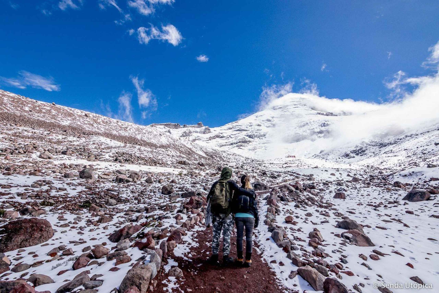 انطلق في رحلة ليوم كامل إلى بركان تشيمبورازو، أعلى نقطة في الإكوادور. استمتع برحلة مشي بصحبة مرشد إلى المعالم الأولى والثانية، وشاهد المحاصيل المحلية وقطعان الأغنام والفيكونا والبيوت التقليدية المصنوعة من القش والطين. انطلق من بانيوس في الساعة 8:30 صباحًا وقم بالقيادة في وسائل النقل الخاصة لمدة ثلاث ساعات تقريبًا. بعد التسجيل في المحطة الأولى، انتقل إلى المعالم الأولى، التي تقع على ارتفاع 4800 متر فوق مستوى سطح البحر. تأقلم مع هذا الارتفاع قبل مواصلة الرحلة إلى القاعدة الثانية، التي تقع على ارتفاع 5041 مترًا فوق مستوى سطح البحر. توجد بحيرة على مسافة 10 دقائق سيرًا على الأقدام من المحطة الثانية في الرحلة، وهي بجوار الأنهار الجليدية. تناول الغداء بعد النزول لمدة 40 دقيقة تقريبًا. أخيرًا، عد إلى السيارة وعد إلى مدينة بانيوس.Includes