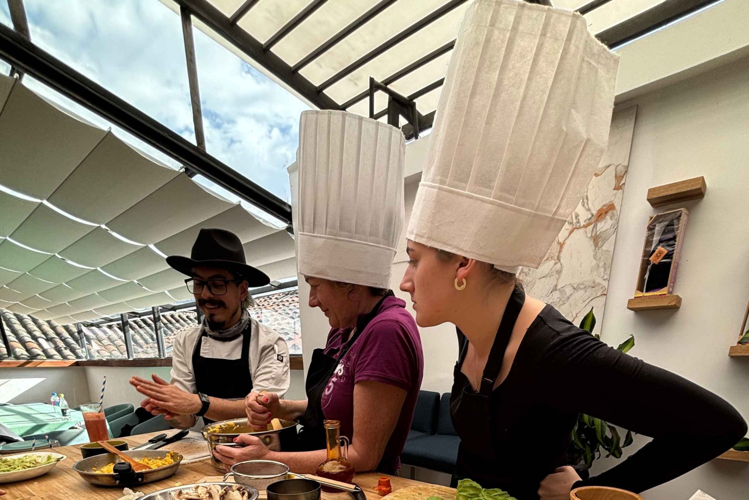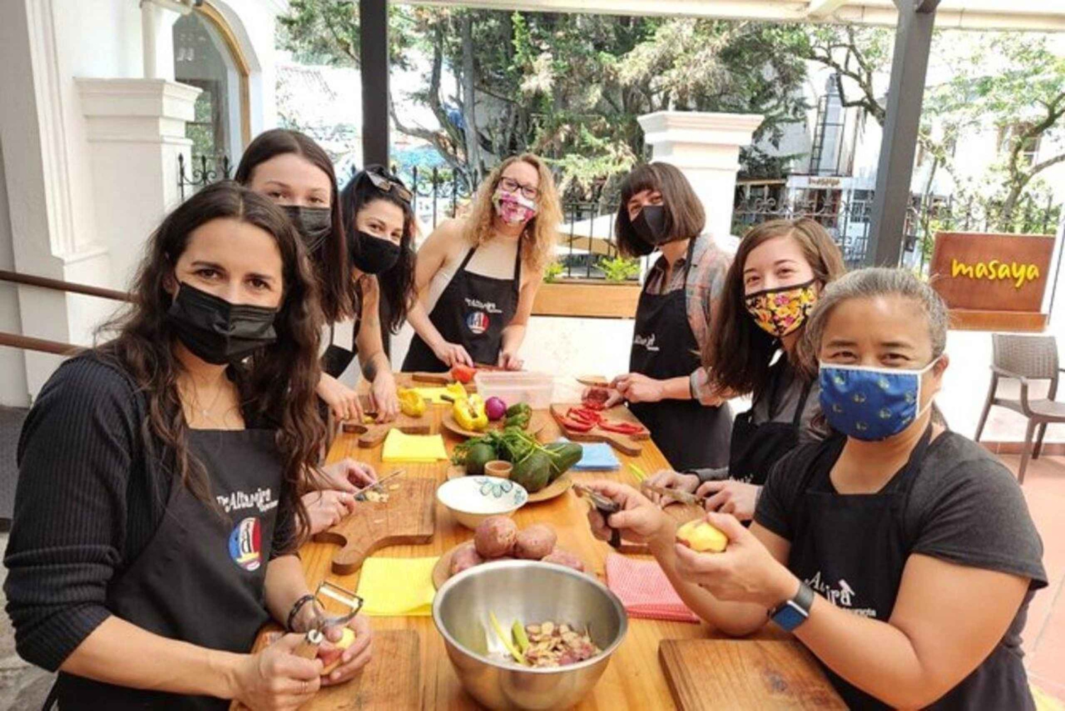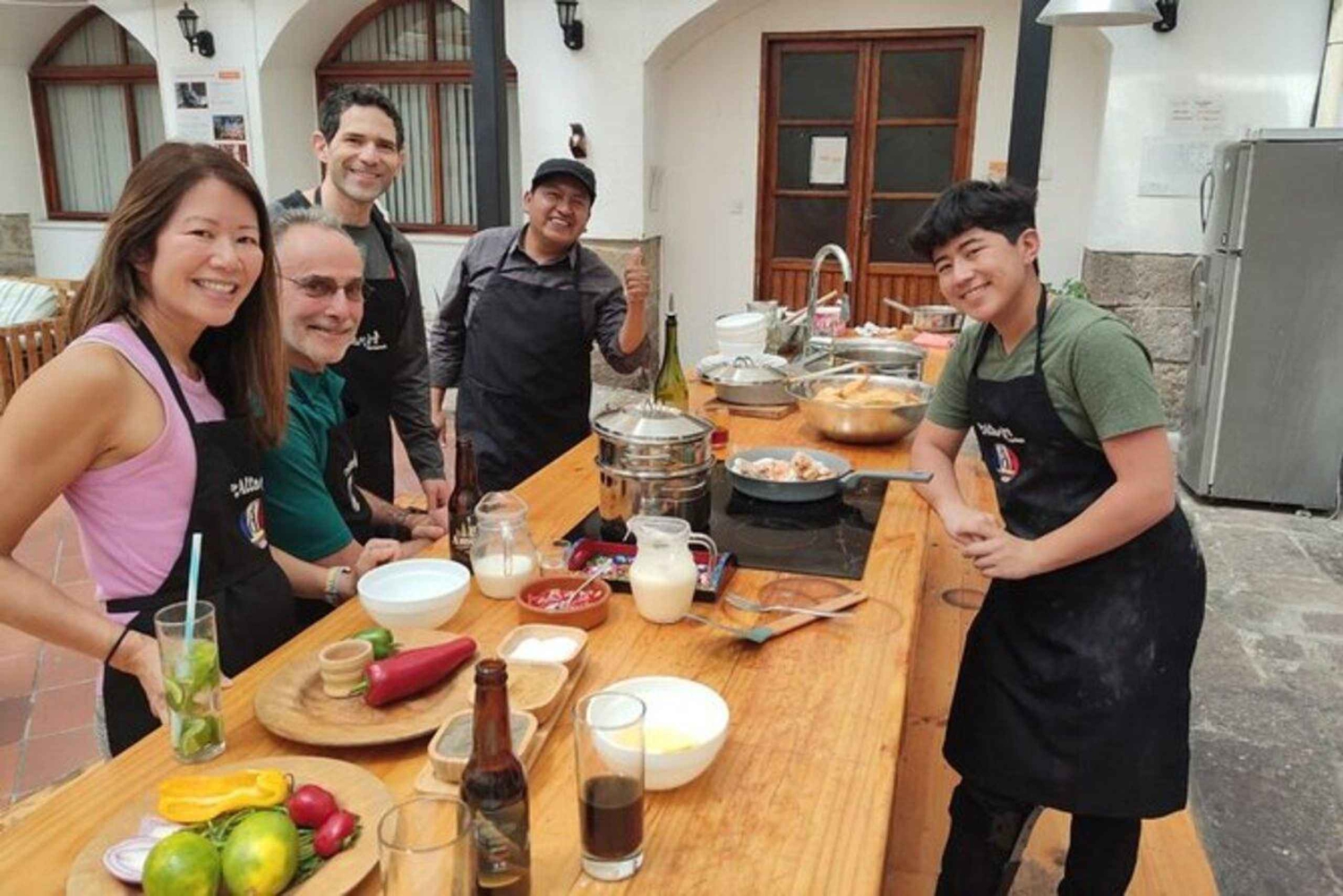 På vores Premium Cooking Class vil du tilberede traditionelle ecuadorianske retter, og samtidig får du mulighed for at tilberede en lækker cocktail kendt som Canelazo. Du vil glæde dig over autentisk ecuadoriansk mad, der er internationalt anerkendt som en af de bedste i Latinamerika og en favorit blandt mange besøgende over hele verden. Lær at lave lækre retter og cocktails, hvor majs, kartofler, quinoa, ris og fisk og skaldyr er hovedingredienserne. Vores kok vil dele sine hemmeligheder og fantastiske teknikker med dig. Uanset om du er nybegynder eller allerede kender til madlavning, er vi sikre på, at denne oplevelse bliver uforglemmelig. En af de bedste måder at lære et land at kende på er gennem dets køkken. Oplev denne ecuadorianske oplevelse, og lær Ecuador at kende indefra. Undervisningen er tilgængelig fra mandag til søndag. Vores menuer kan også være vegetariske, og på forespørgsel kan vi lave personlige menuer. Eksempel på menu Forret Lokale empanadas i kokkens stil Hovedret Ecuadoriansk ceviche Dessert Figner på karamelsirup - meget lokalt fra AndesbjergeneIncludes