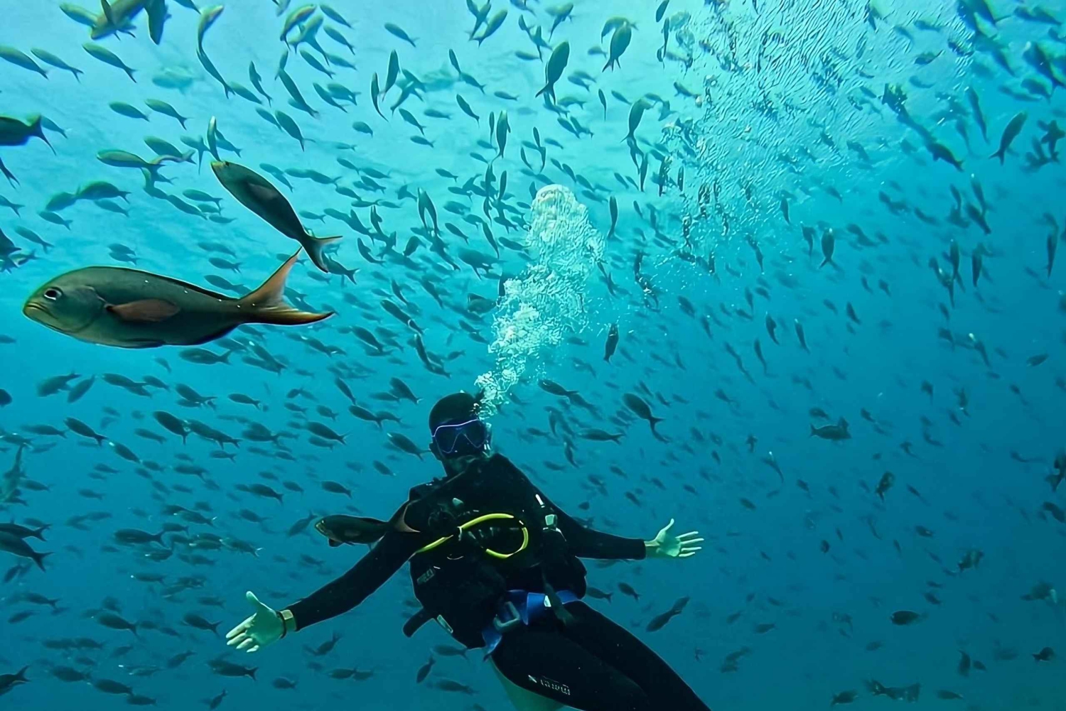 Embark on an unforgettable diving adventure with Enchanted Islands in the North Seymour Channel, one of the most outstanding destinations in the Galapagos Islands. This tour starts at 7:00 am from Puerto Ayora and has a total duration of 8 hours. It is suitable for both beginners and experienced divers, offering two dives for divers with open water, advanced or master certification, and one dive and one snorkeling session for those without a license. During the dives, you will be able to observe a rich marine life, including white tip sharks, sea turtles, barracudas, devil rays, manta rays and hammerhead sharks. Currents in the channel are moderate, although they can be strong at times. The tour includes complete diving equipment (wetsuit, BCD, boots, regulator with computer, tanks, mask and cap), professional tour guide (PADI instructors and bilingual adventure guides), snorkeling equipment (mask and snorkel), towels on board, lunch and snacks, as well as transportation from Puerto Ayora to the Itabaca Channel and navigation to North Seymour. Sodas, alcoholic beverages and tips for the tour guide and crew are not included. Enjoy a unique experience exploring the impressive marine biodiversity of the Galapagos Islands with Enchanted Islands.Includes