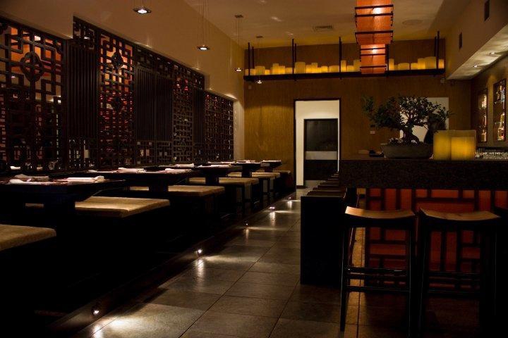 The restaurant is noted for its expressive interior design; the space incorporates both wide, open areas and secluded, hidden tables; all illuminated with incredibly soft lighting in a minimalist and elegant décor.
